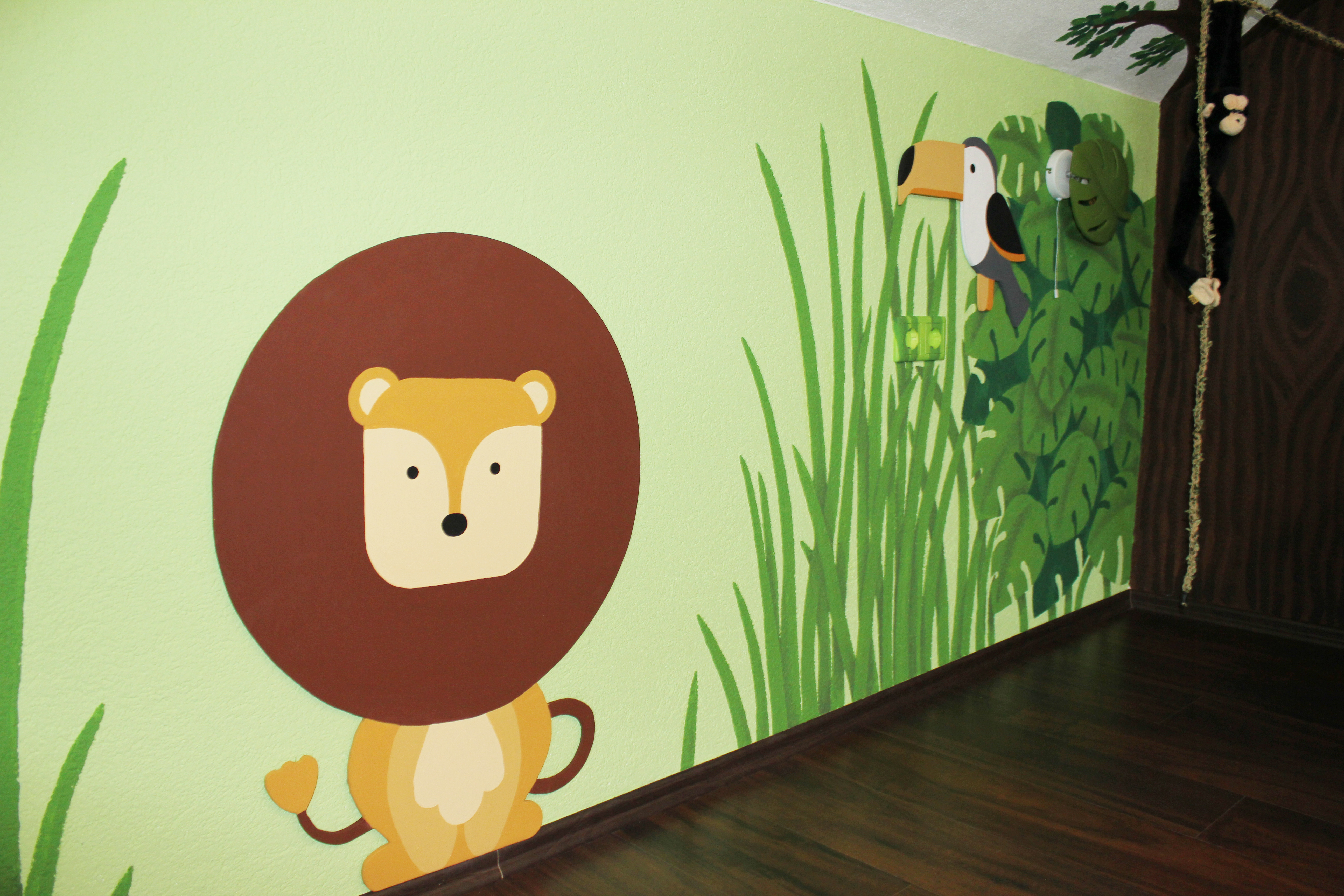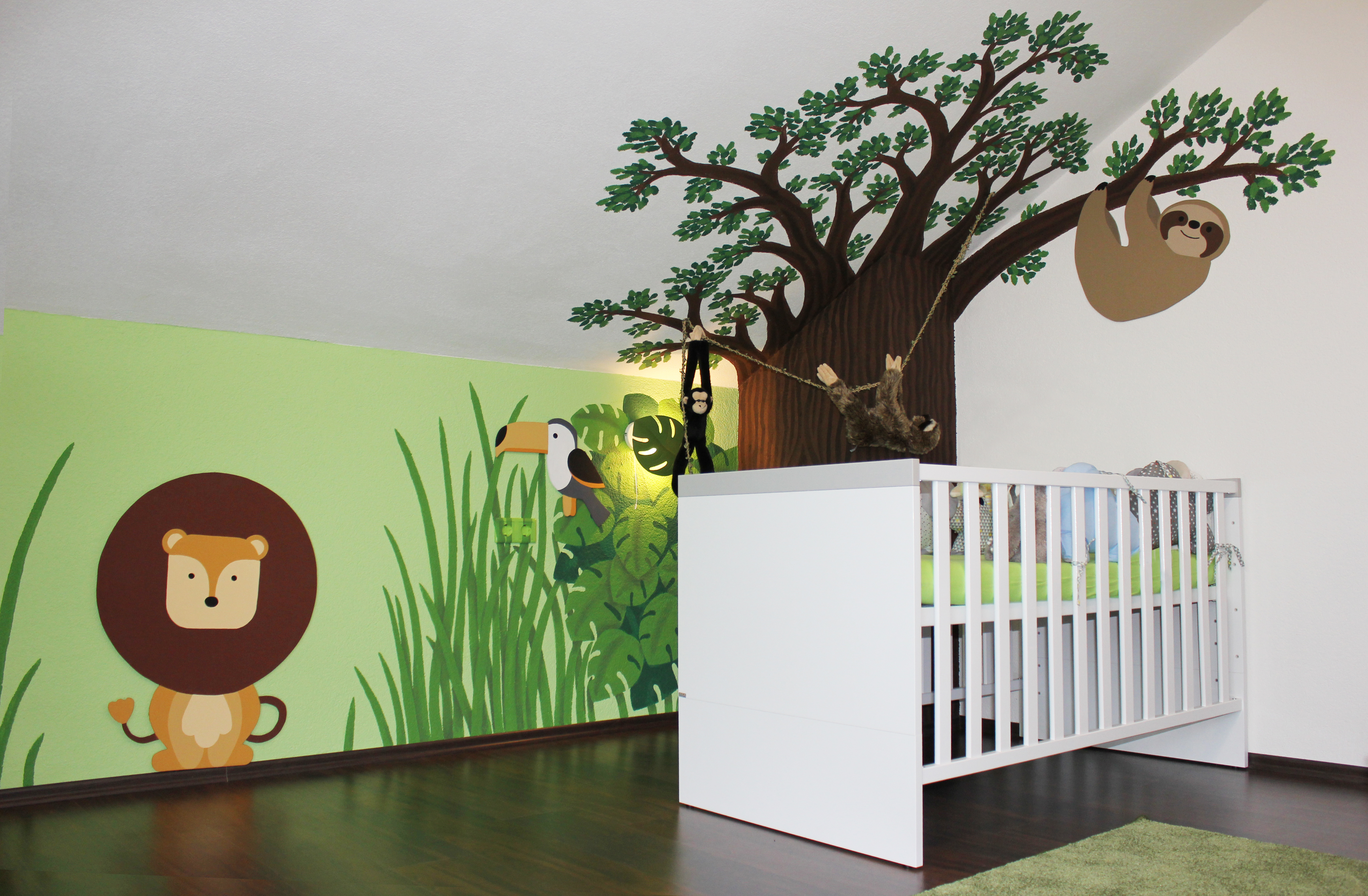 Gestaltung eines Kinderzimmers nach dem Motto "Dschungel" durch Wandbemalung, austauschbare Holztiere und Deko.